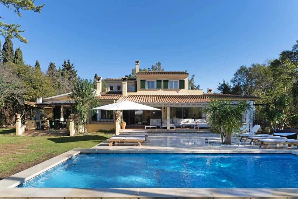 The estate comprises a main house and a guesthouse, providing a total of six bedrooms, four bathrooms, and three guest toilets. The main house features four fireplaces and spacious living areas, including a drawing room, office space, a generous dining area, a fully equipped kitchen, laundry room, storage, and a wine cellar.