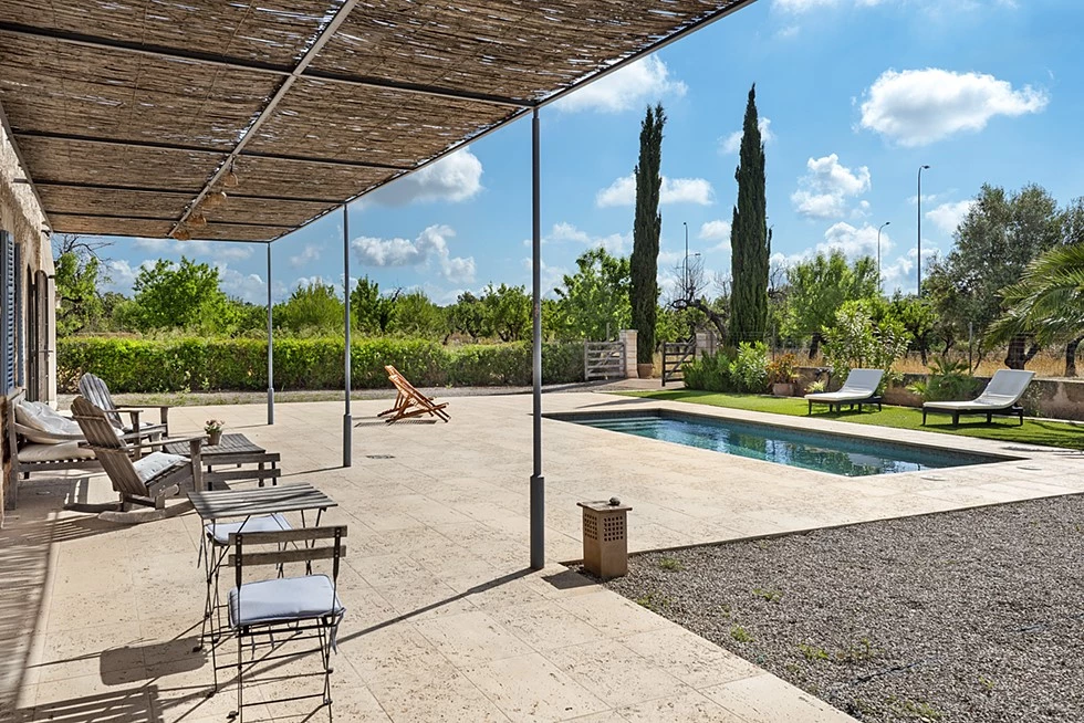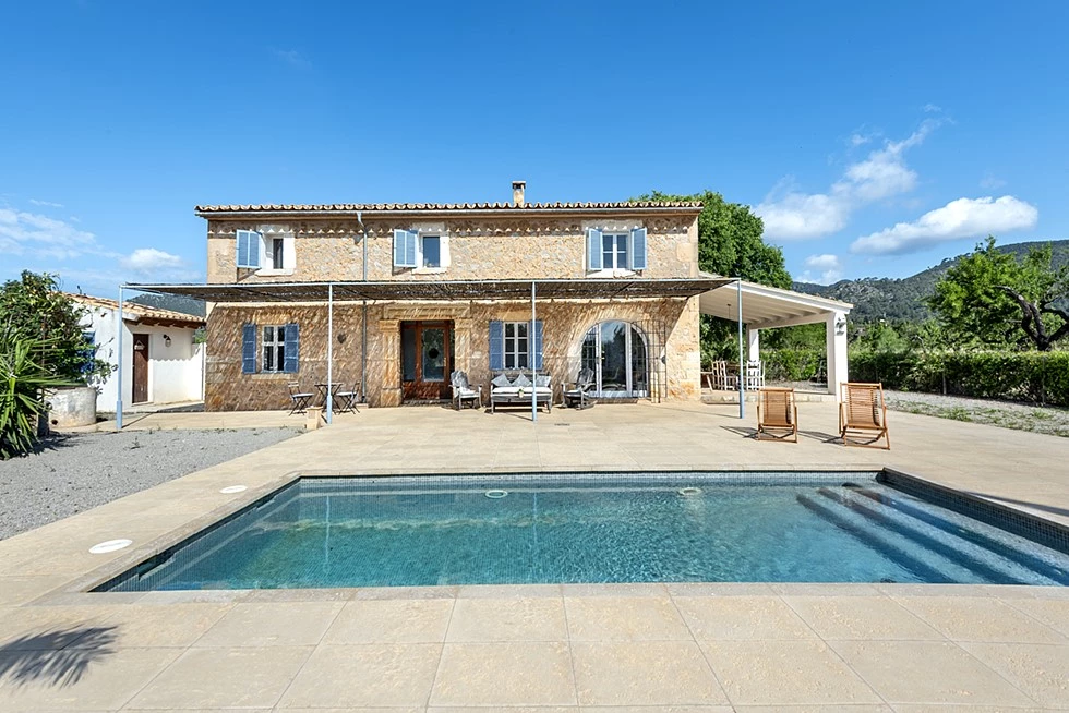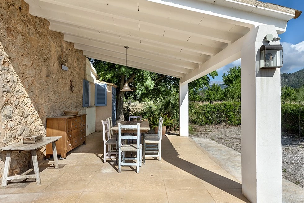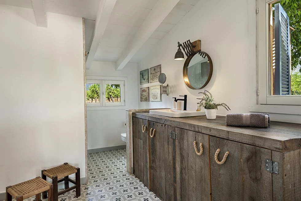 Outside, the property truly shines. A large terrace overlooks the surrounding countryside and the Tramuntana mountains, while the landscaped garden and private swimming pool create an idyllic setting for enjoying sunny days and warm Mediterranean evenings.