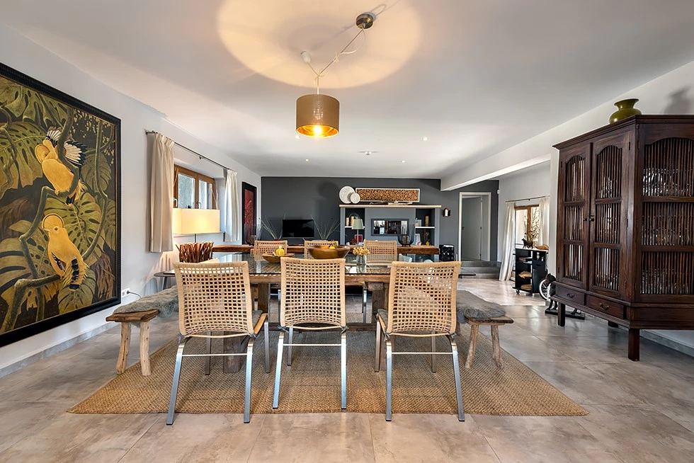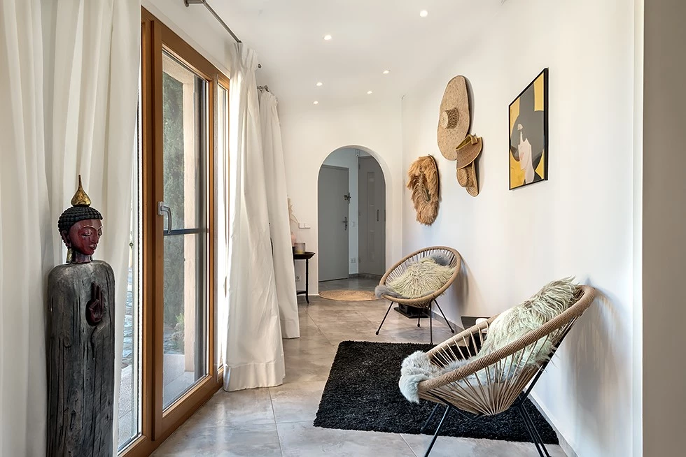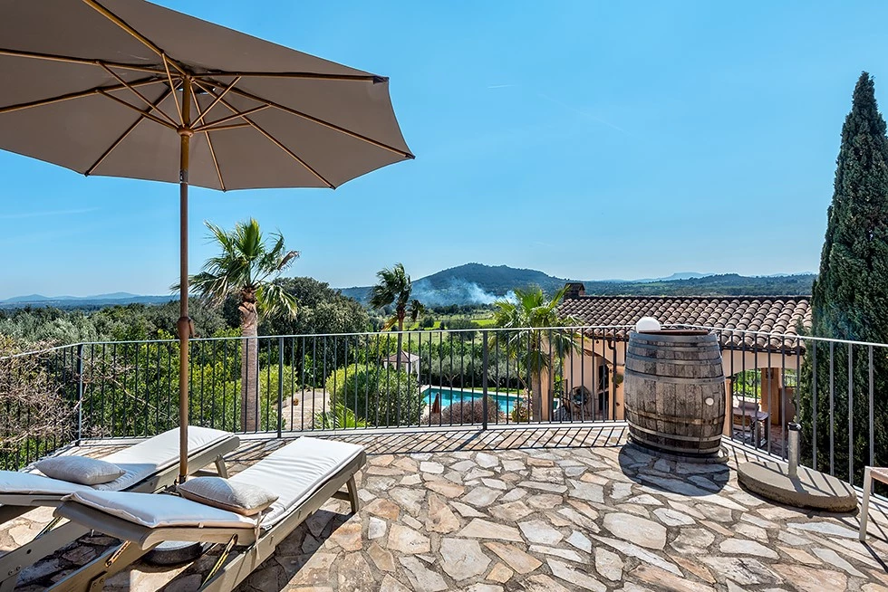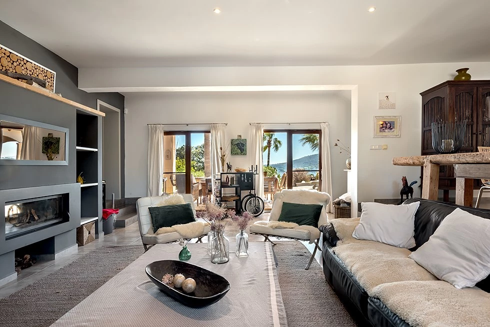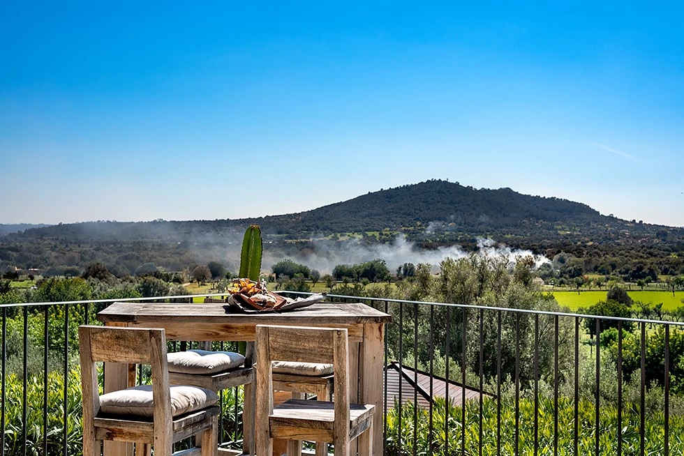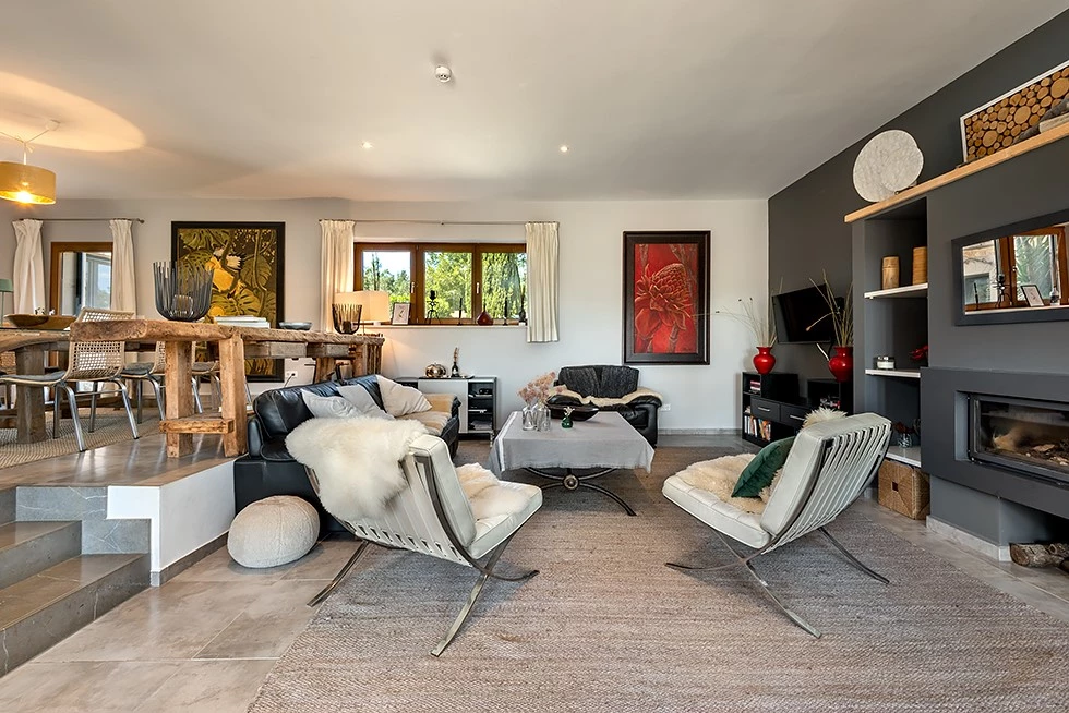 Outdoor living is at the heart of this property, with multiple terraces, elegant chill-out zones, Balinese daybeds, and uninterrupted panoramic views across the surrounding countryside. The garden, enriched with fruit trees, enhances the Mediterranean atmosphere and sense of tranquility.