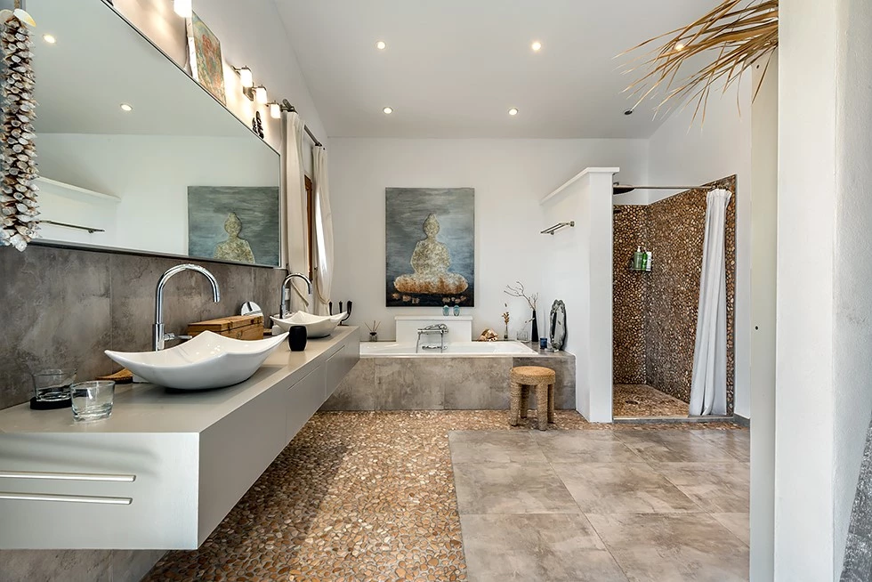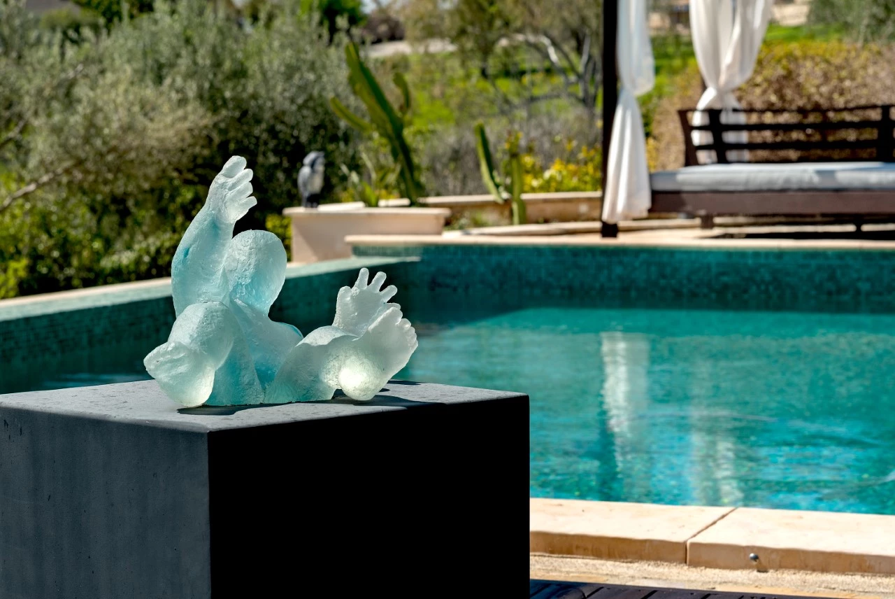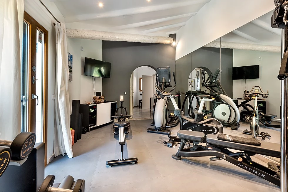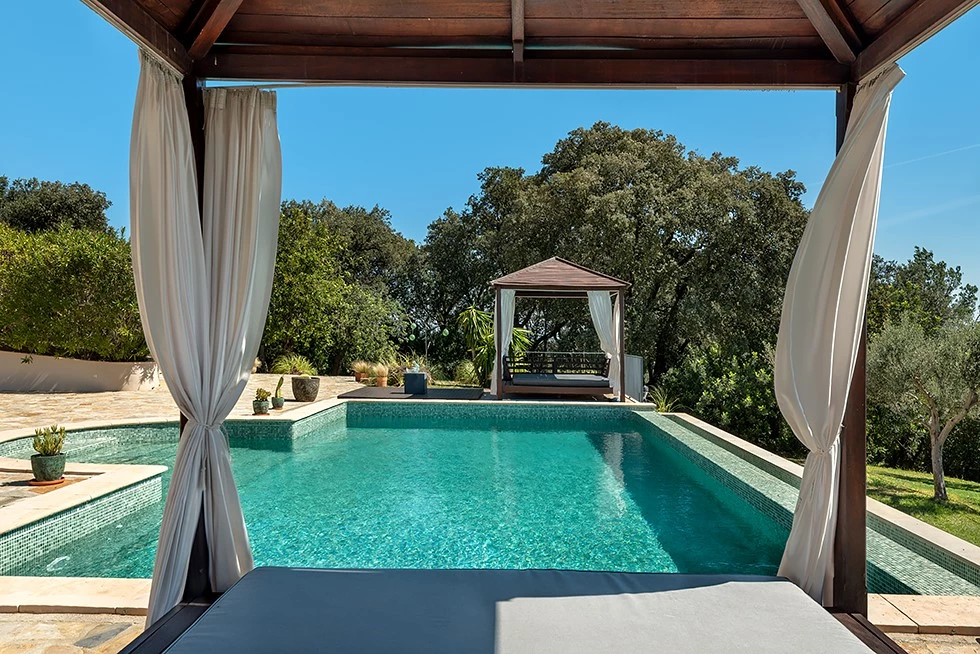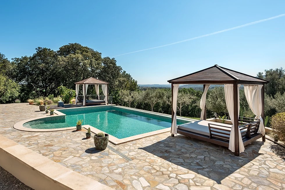 Outdoor living is at the heart of this property, with multiple terraces, elegant chill-out zones, Balinese daybeds, and uninterrupted panoramic views across the surrounding countryside. The garden, enriched with fruit trees, enhances the Mediterranean atmosphere and sense of tranquility.