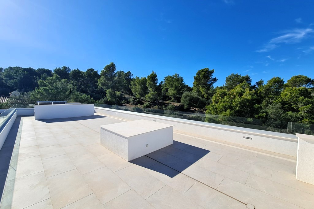 Outdoor living is at the heart of this home, highlighted by an impressive sea-facing infinity pool, beautifully landscaped gardens, and expansive terraces ideal for relaxing or entertaining. A spectacular rooftop terrace, prepared for an outdoor kitchen, offers panoramic views and an exclusive setting to enjoy sunsets over the coast.