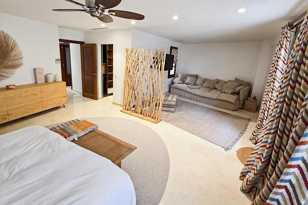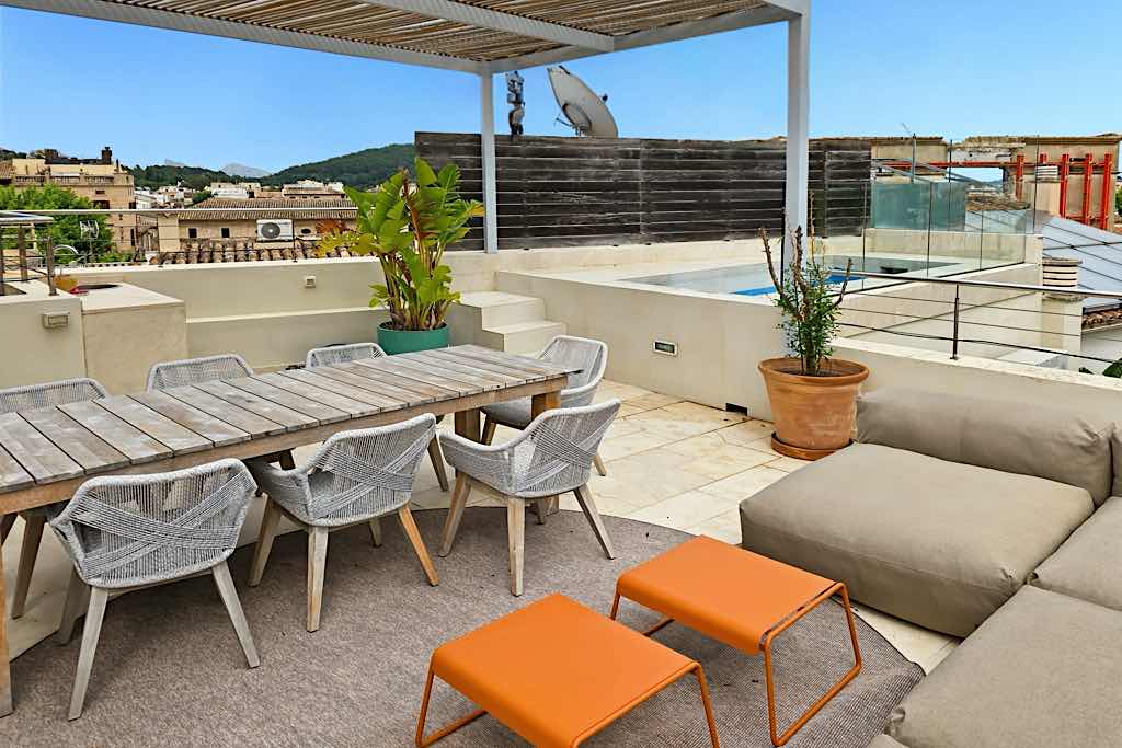 One of the standout features is the spectacular rooftop terrace, complete with a heated pool and breathtaking views of Puig de Maria — the perfect setting to relax or entertain while enjoying the unique surroundings.