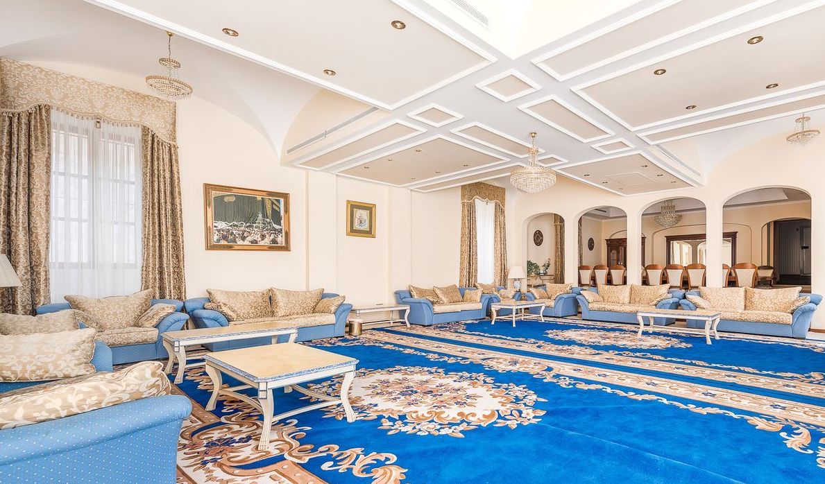 The interiors combine historic character with functional spaces, including several reception rooms, a professional kitchen, and additional facilities designed to accommodate large groups and events. A dedicated events pavilion with air conditioning, along with multiple lounges and service areas, further enhances the versatility of the property.