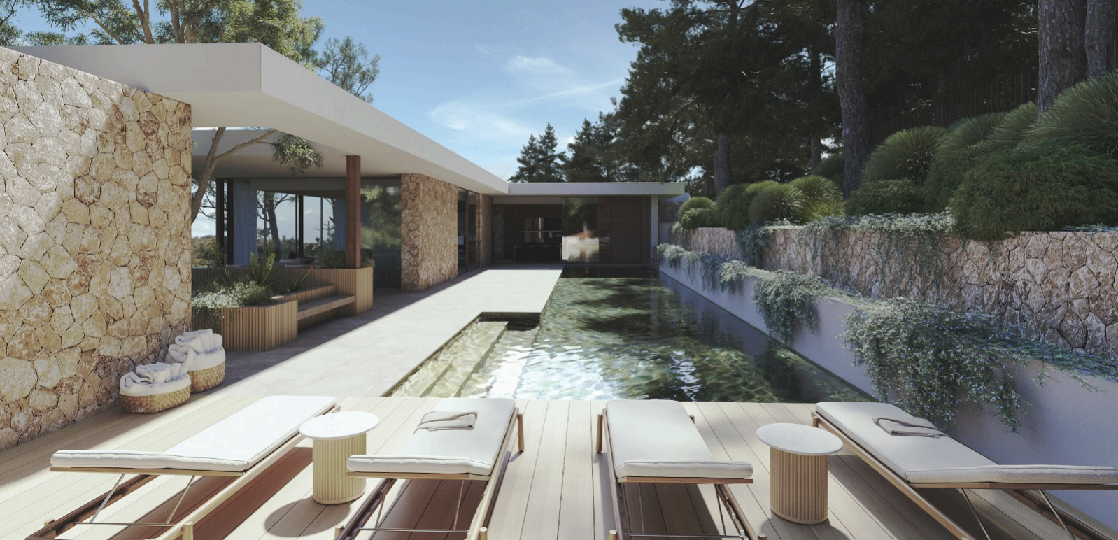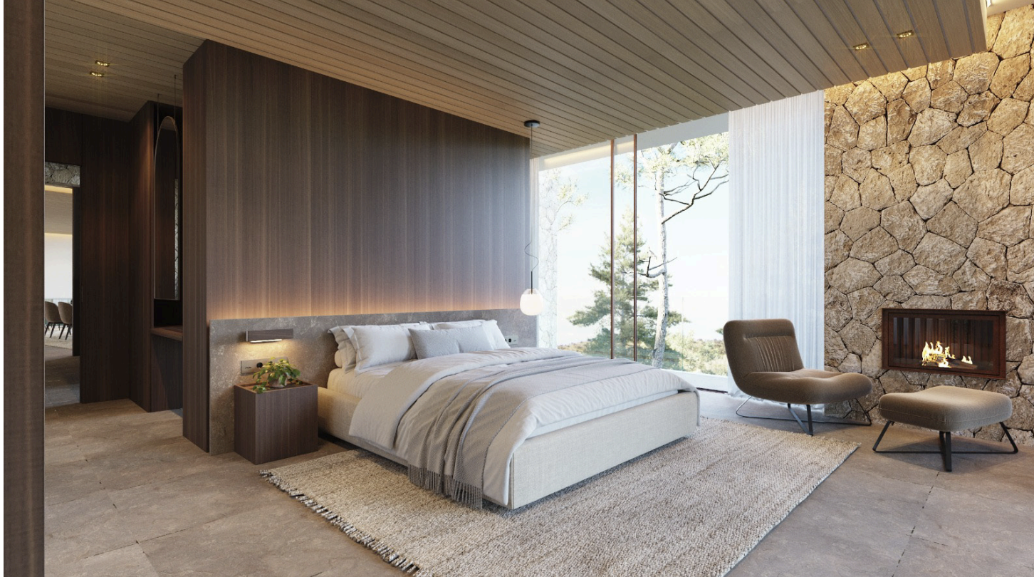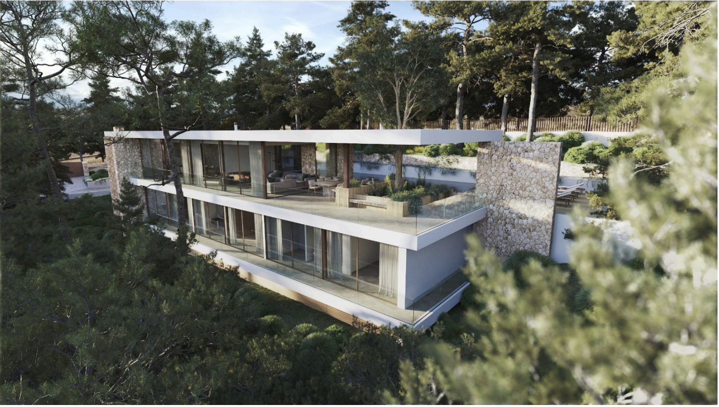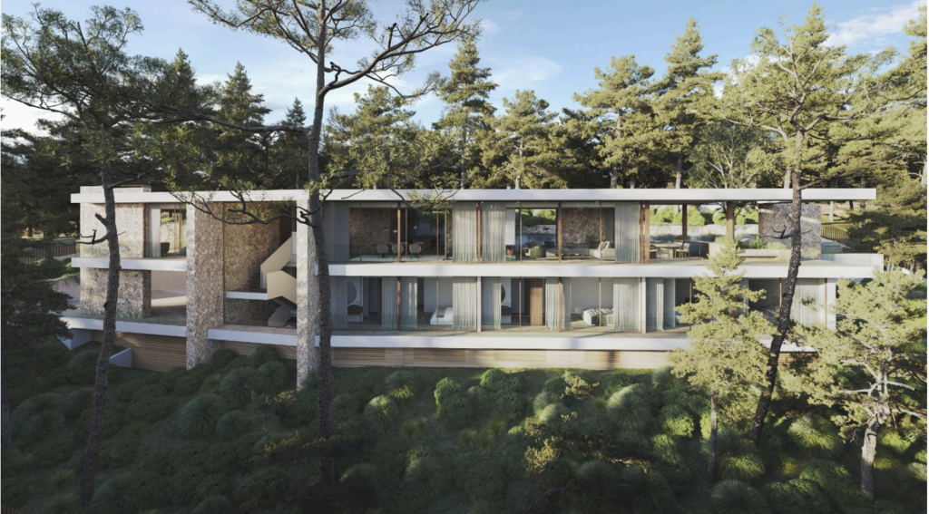 The property is not a completed villa, but a turnkey project, offering the future owner the possibility to develop a stunning residence designed to blend seamlessly with its natural Mediterranean surroundings. The approved design showcases a modern architectural concept with expansive living spaces, floor-to-ceiling windows, and a strong connection between indoor and outdoor areas.