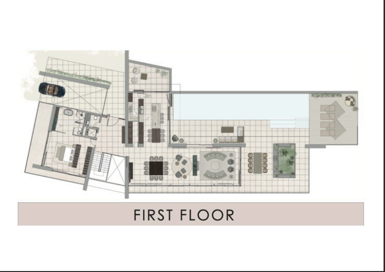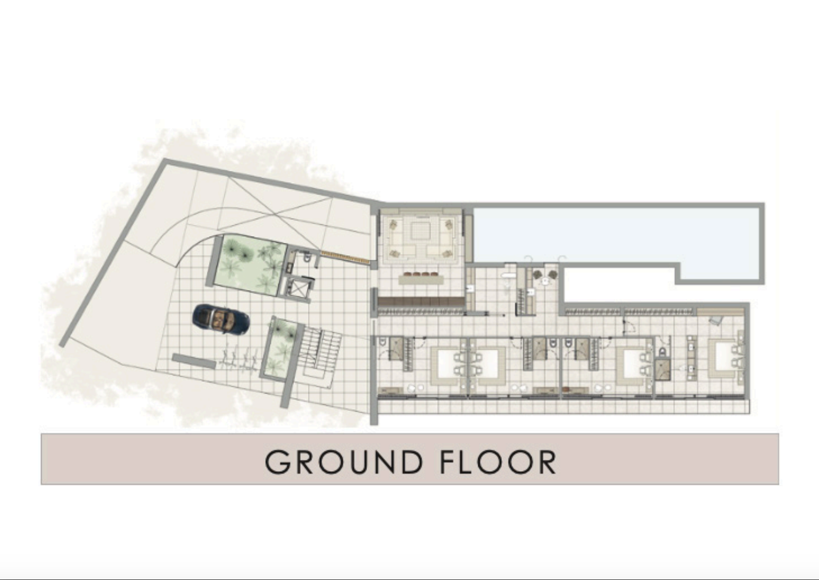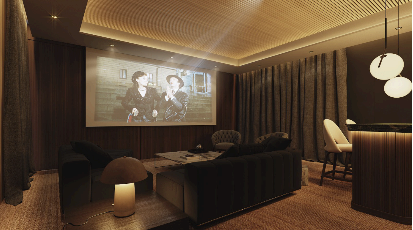The planned villa features generous proportions, including a spacious living and dining area, multiple suites, and premium lifestyle amenities such as a private pool, solarium, terraces, and a home cinema. The design also includes a garage for several vehicles and beautifully integrated outdoor areas, creating a true luxury retreat.