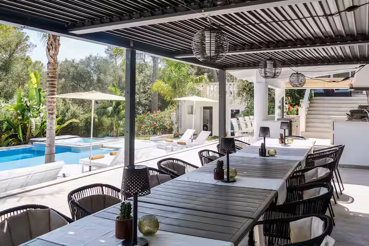 Designed for larger groups and family gatherings, the villa comfortably accommodates up to 20 guests across 10 bedrooms and 7 bathrooms, with generous indoor and outdoor living spaces to relax and enjoy the Mediterranean lifestyle.